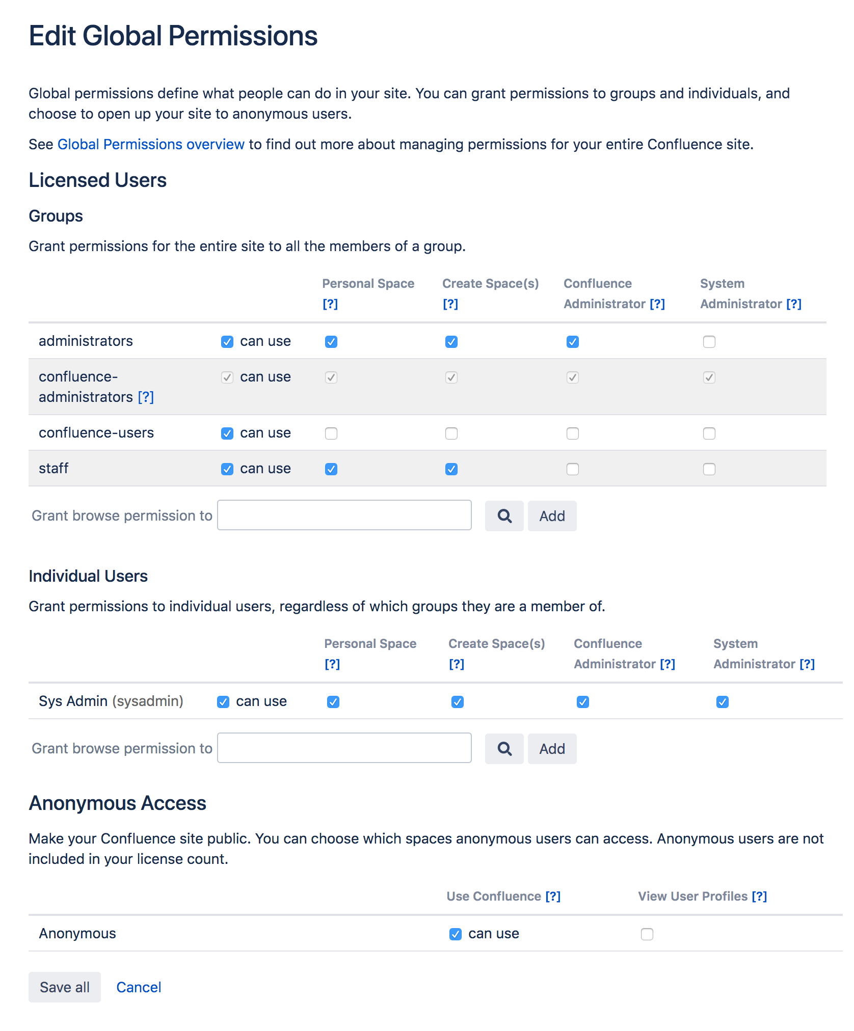 | System Administrator | Allows the user to access the Confluence administration console and perform all administrative tasks. See the detailed comparison of administrator permissions below. |