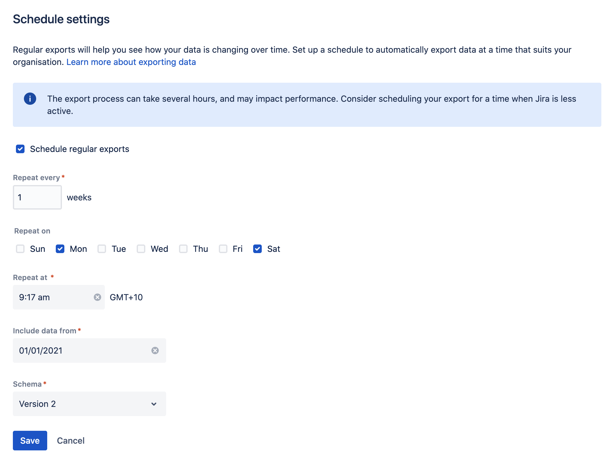 You can schedule exports to happen as often as you need. If you choose to export on multiple days, the first export will occur on the nearest day after you save the schedule. Using the example in the screenshot above, if you set up your schedule on Thursday, the first export would occur on Saturday, and the second export on Monday. We don’t wait for the start of the week.