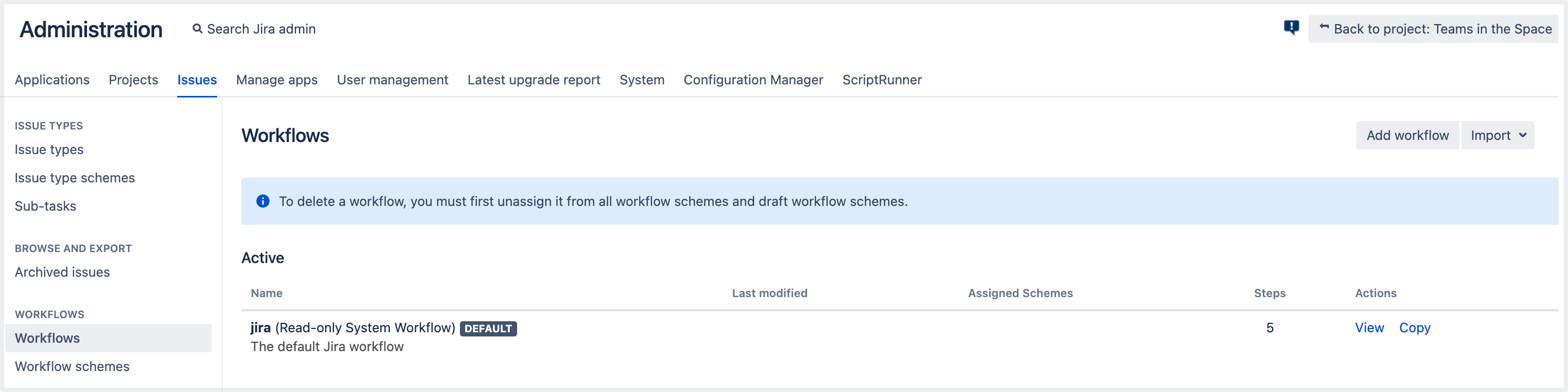You can access all the active and inactive workflows that exist on your Jira instance from the Workflows tab: