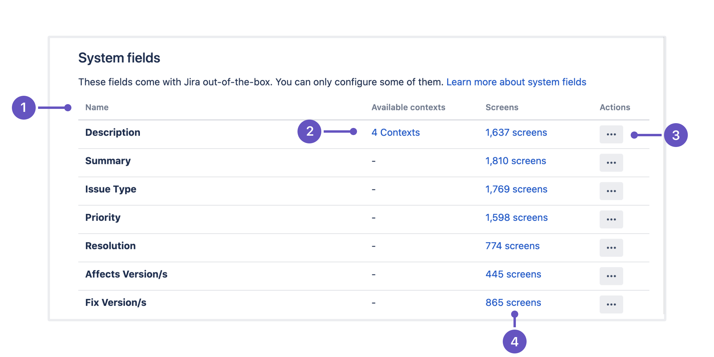 - Actions: Configure your system fields by defining associated screens. For the Description field, you can also define contexts and the default values.