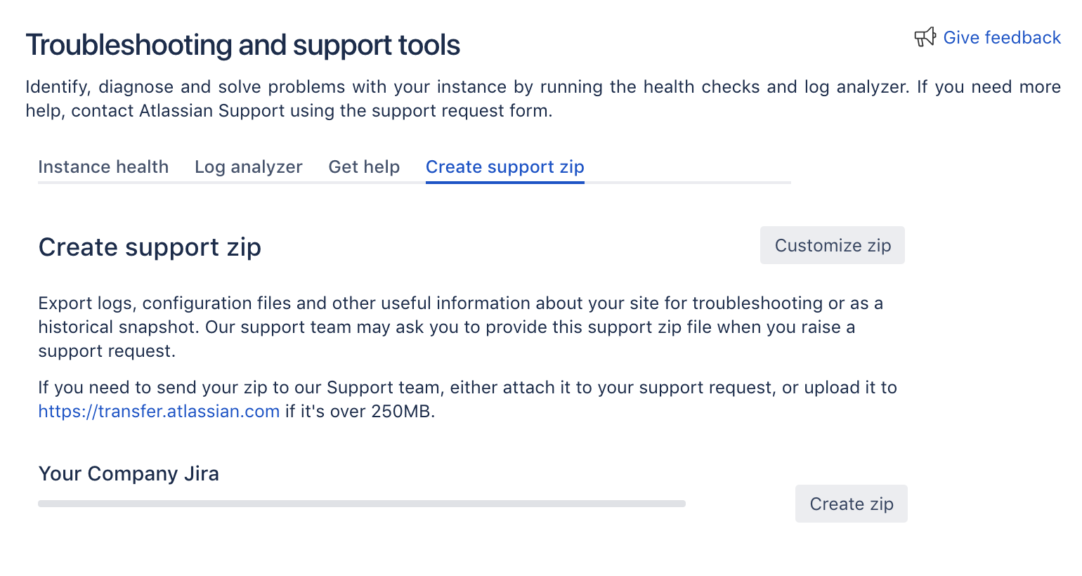 The Atlassian Support team may need you to provide a support zip to help them understand and troubleshoot your problem, after you have raised your initial request. The support zip contains logs from your instance and diagnostic and configuration information.