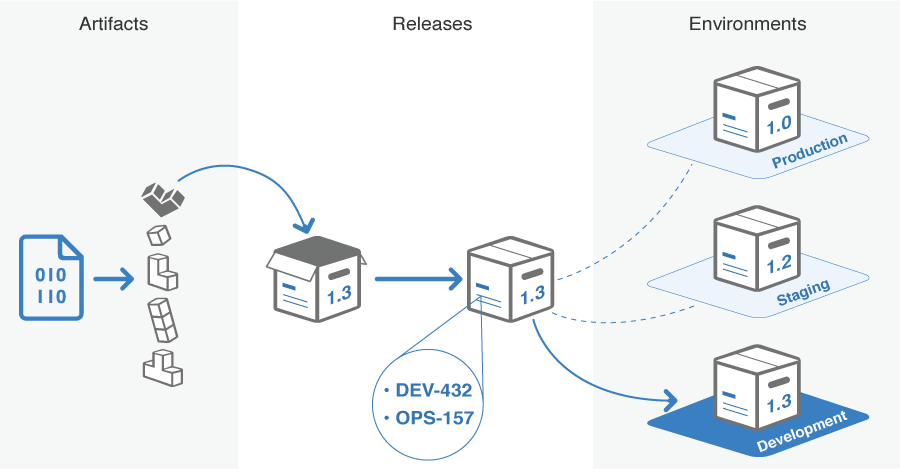 - Release – Identifies a snapshot of artifacts and its associated data such as commits, Jira issues and the builds that were used to test it. As a release contains the information of the difference between itself and the release beforehand, it's very easy to see the changes between releases or to show the difference between the software deployed on two different environments. Releases also track what environments they have been deployed to.