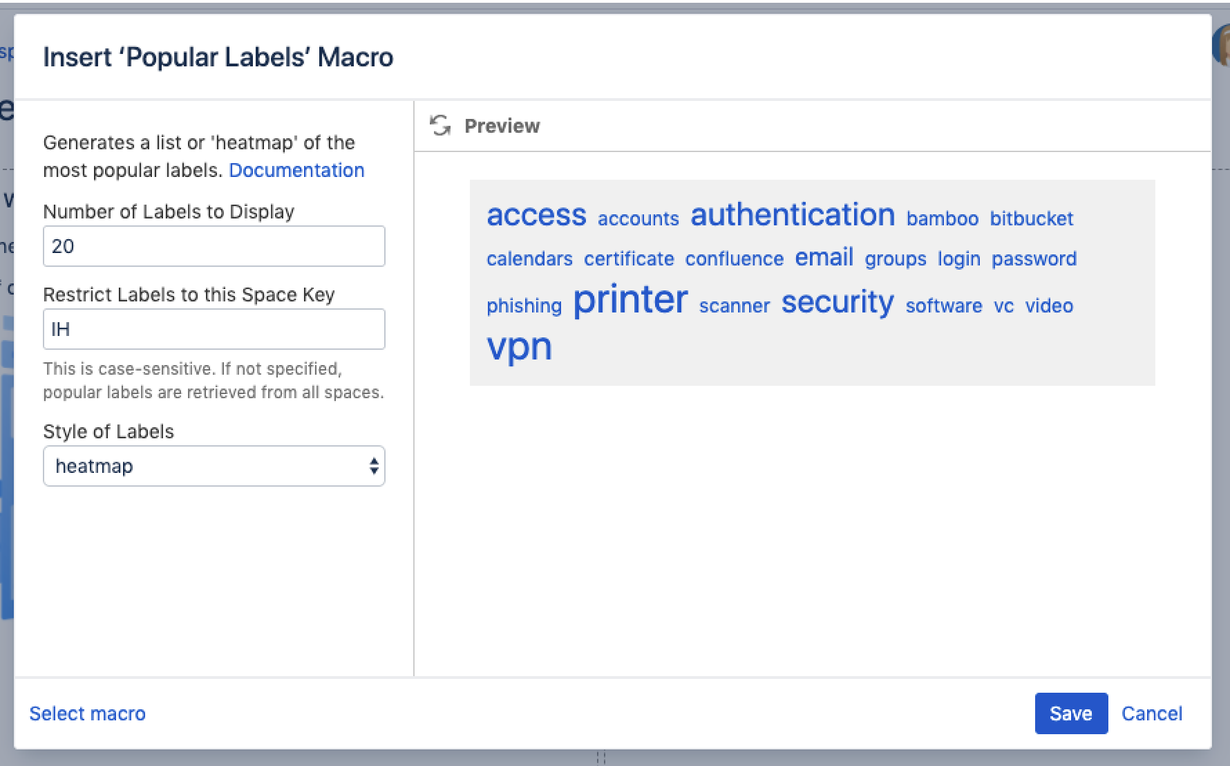 Screenshot: The Popular Labels macro showing a heatmap of the 20 most popular labels.