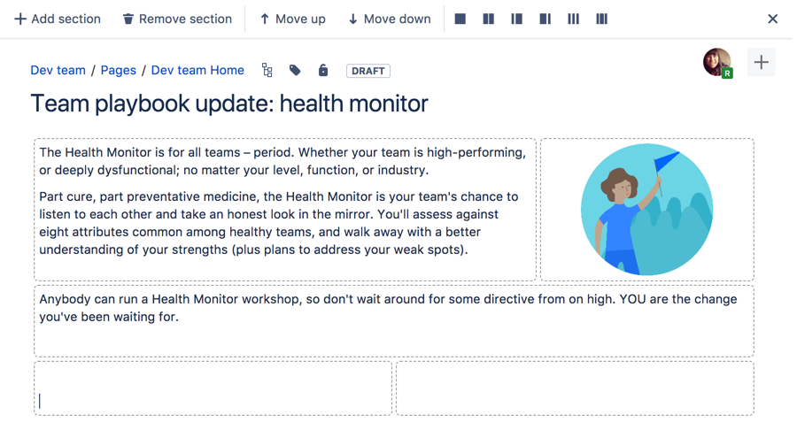 Any text, images or macros in your section are not lost when you change the column layout. When you decrease the number of columns, Confluence will move your content to the left. When you increase the number of columns, Confluence will add blank columns to the right of your existing content.