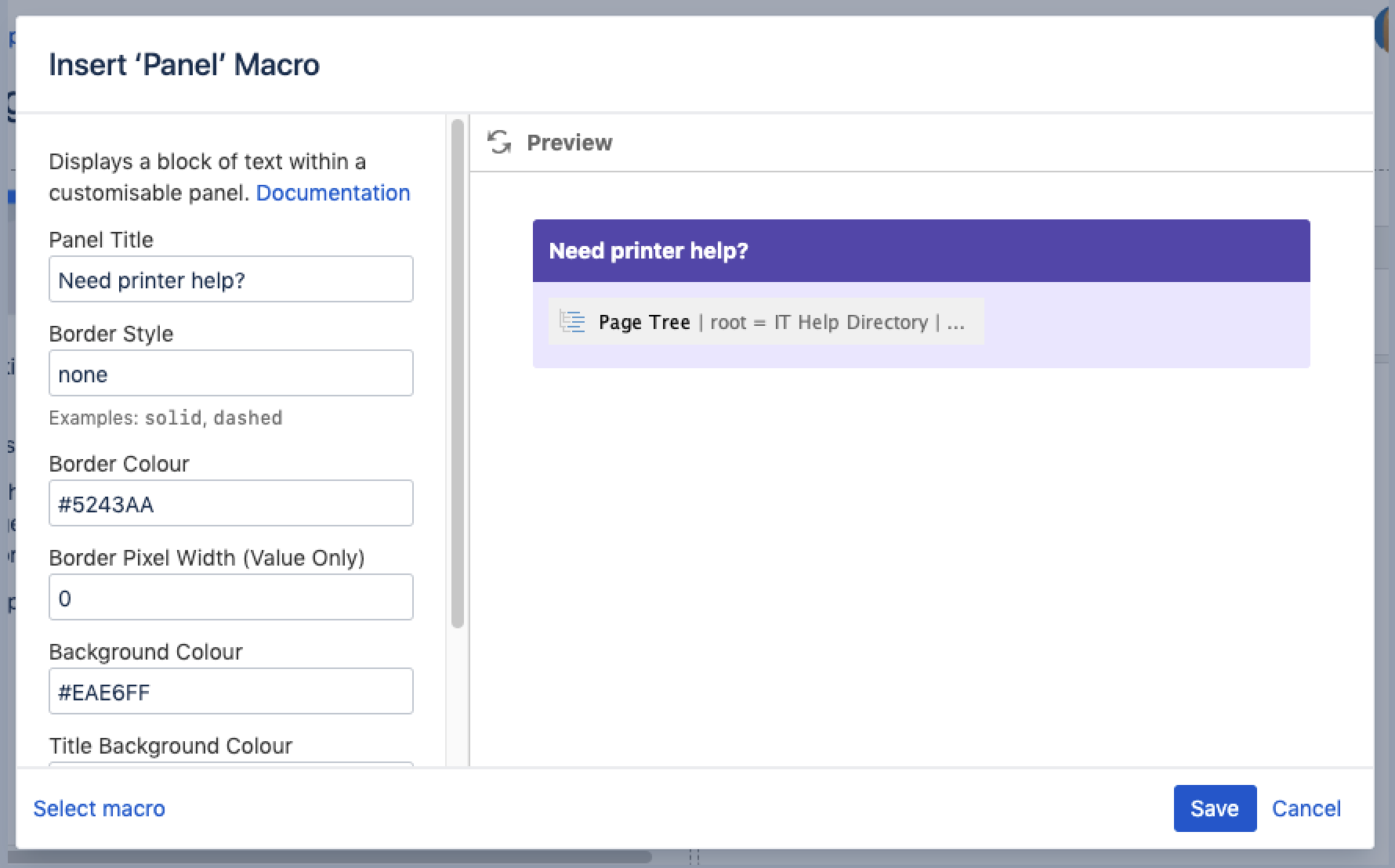 Screenshot: specifying a title, border, and background color in the Panel macro.