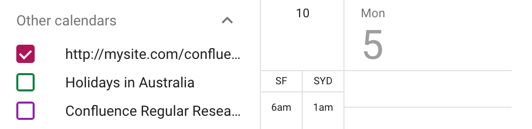 - There is currently a known issue with Google Calendar where a calendar subscription can't be added, or does not display events CONFSERVER-53690 - Getting issue details... STATUS