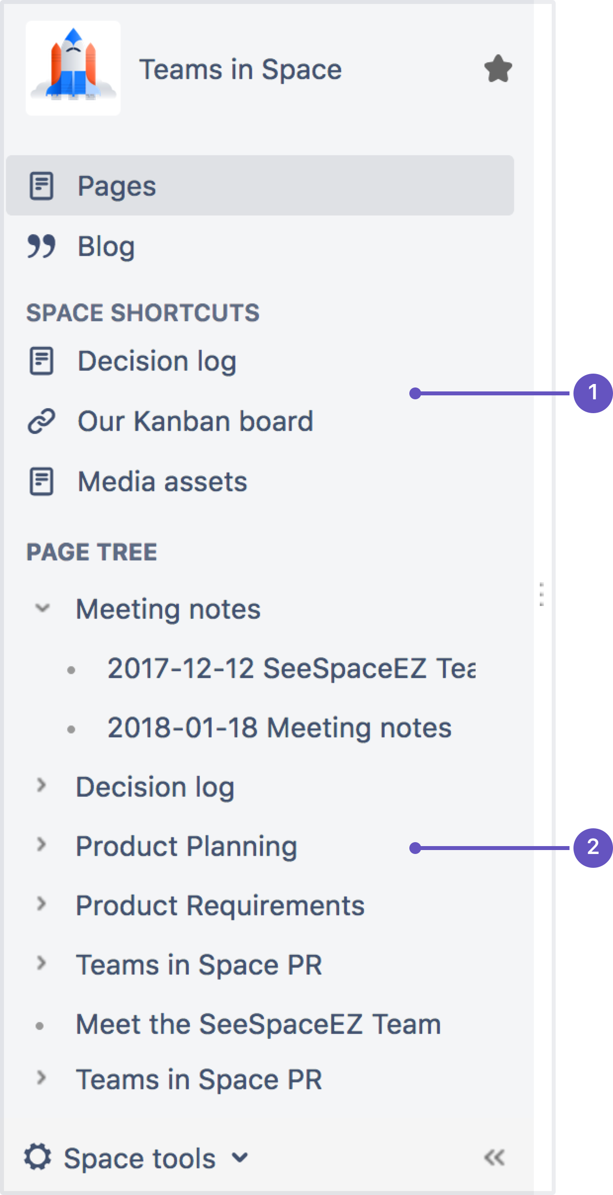 The See Space EZ team will find their meeting notes, decisions, requirements, and other pages in the sidebar. Basically any page you create in the space will appear in the sidebar by default.