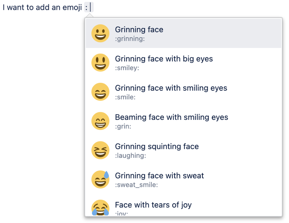 - Type ':' and browse the emoji suggestions with your mouse or up/down arrows