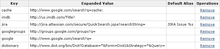 - Enter a Default Alias. This is the text of the link which will be displayed on the page where the shortcut is used, with the user's text being substituted for '%s'.