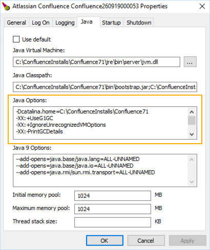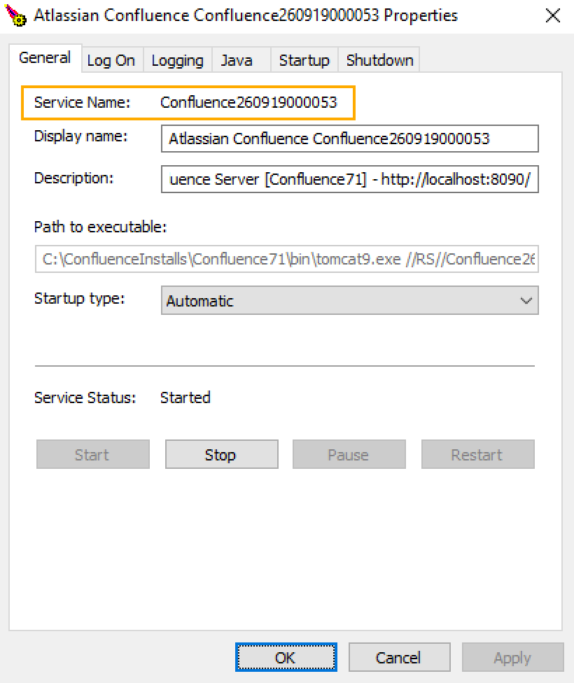 cdto thebindirectory of your Confluence instance and run the following command:tomcat9w //ES//<SERVICENAME>In the above example, it would be