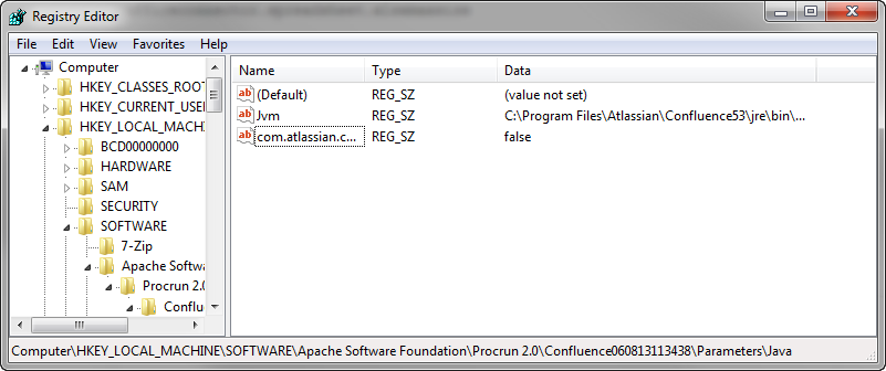 32bit:HKEY_LOCAL_MACHINE >> SOFTWARE >> Apache Software Foundation >> Procrun 2.0 >> Confluence service name - To change existing properties double-click the appropriate value.