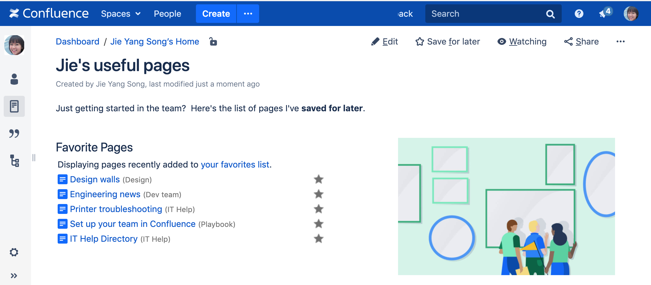Add the Favorite Pages macro to a page to display a list of all the pages you've saved for later.