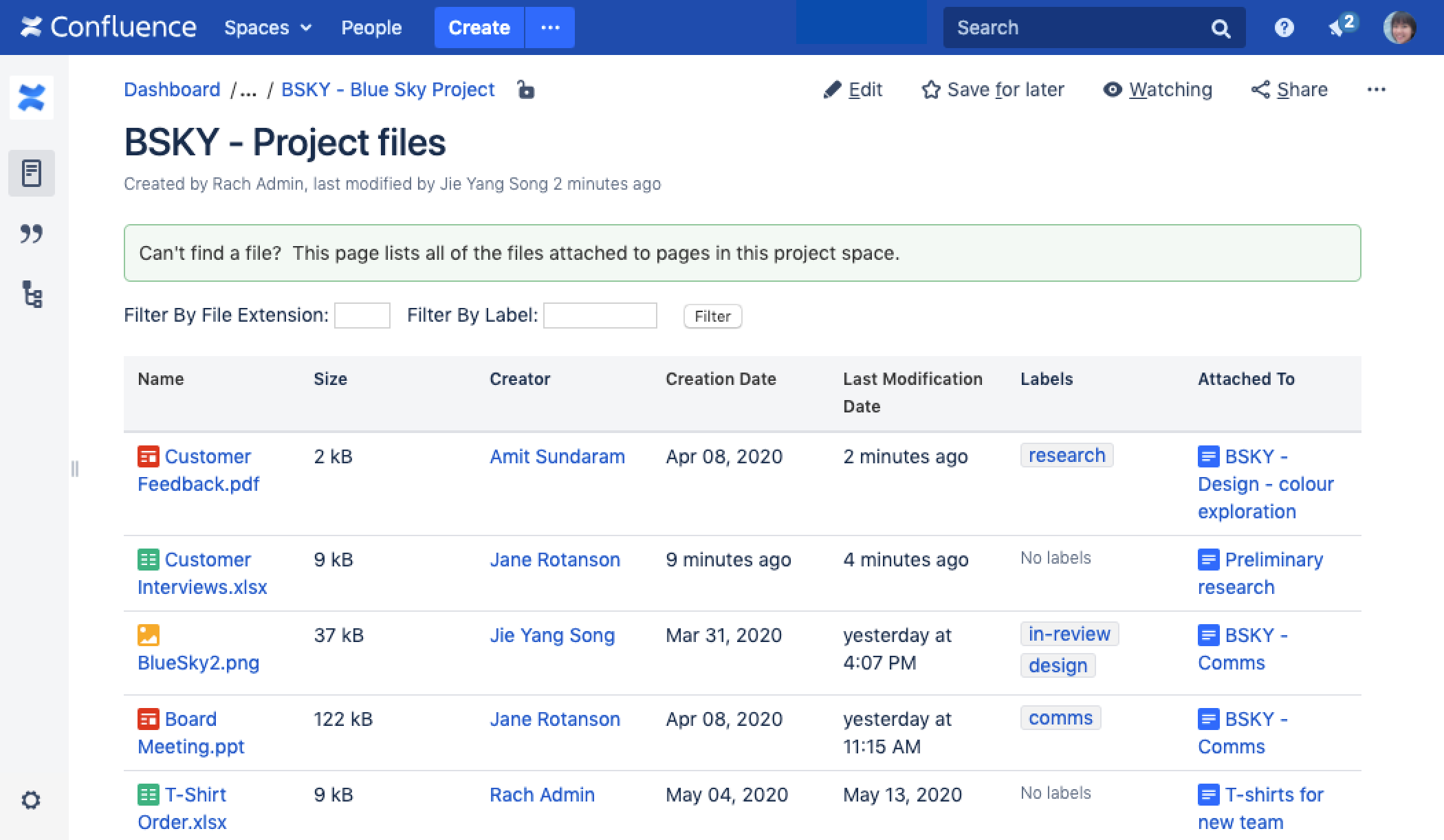 Screenshot: A page containing the Space Attachments macro, to provide quick access to files used in a project.
