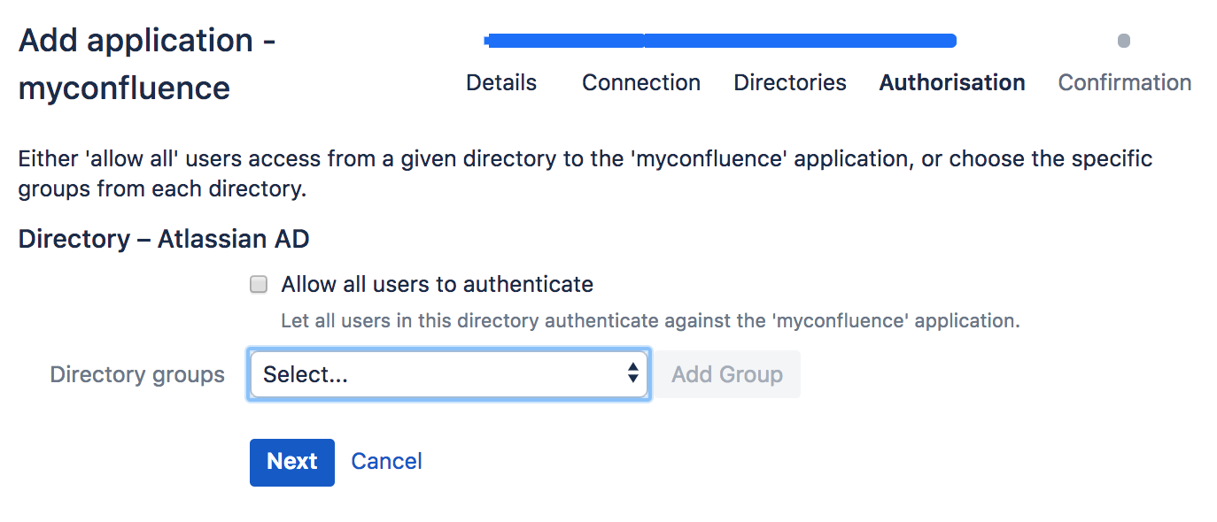 For each directory, you should do one of the following:- Select Allow all users to authenticate, to grant application access to all users defined in the directory, or
