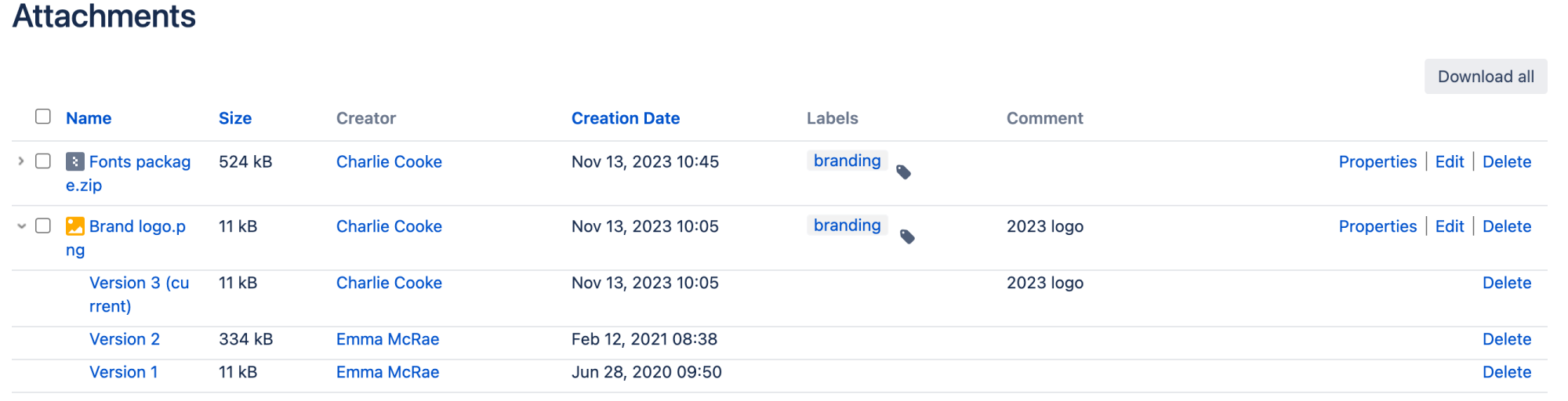 Once attached you can download, delete, and edit these files. Confluence will also manage attachment versions when you upload a new file or change the location of the attachment.