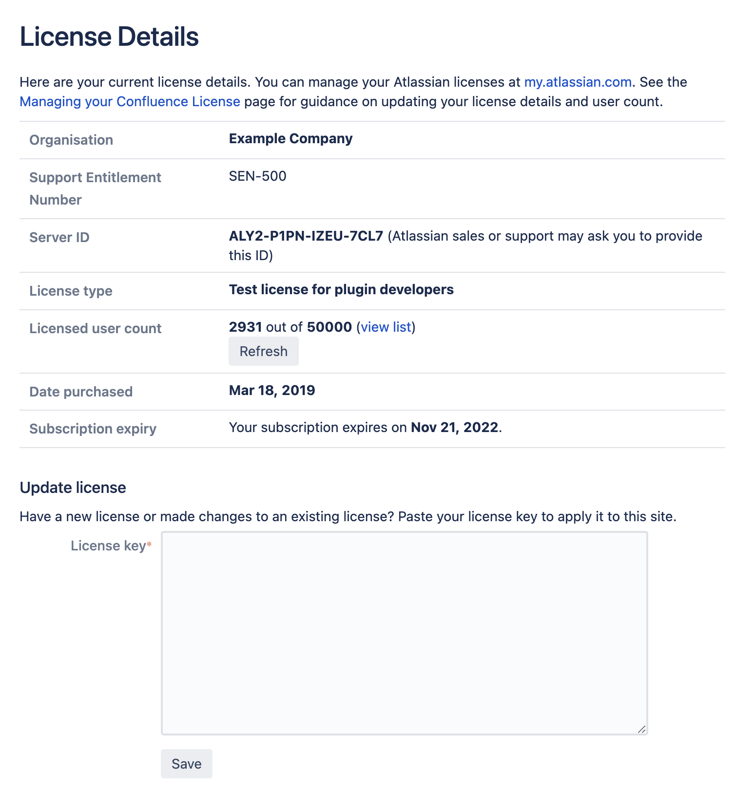 - Your server ID which is generated when you install Confluence for the first time and remains the same for the life of the installation (including after upgrades or changes to your license).