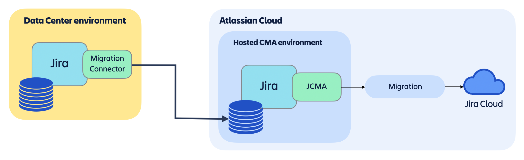 Hosted CMA (Cloud Migration Assistant) is Atlassian’s next-generation solution for migrating Jira Data Center instances to Atlassian Cloud. Hosted CMA moves the migration logic to the cloud, allowing you to replicate your Data Center instance to an Atlassian-hosted environment and run the migration from the new location. This approach eliminates the need for repeatedly sending database dumps to Atlassian and manual infrastructure setup, streamlining both test and production migrations.