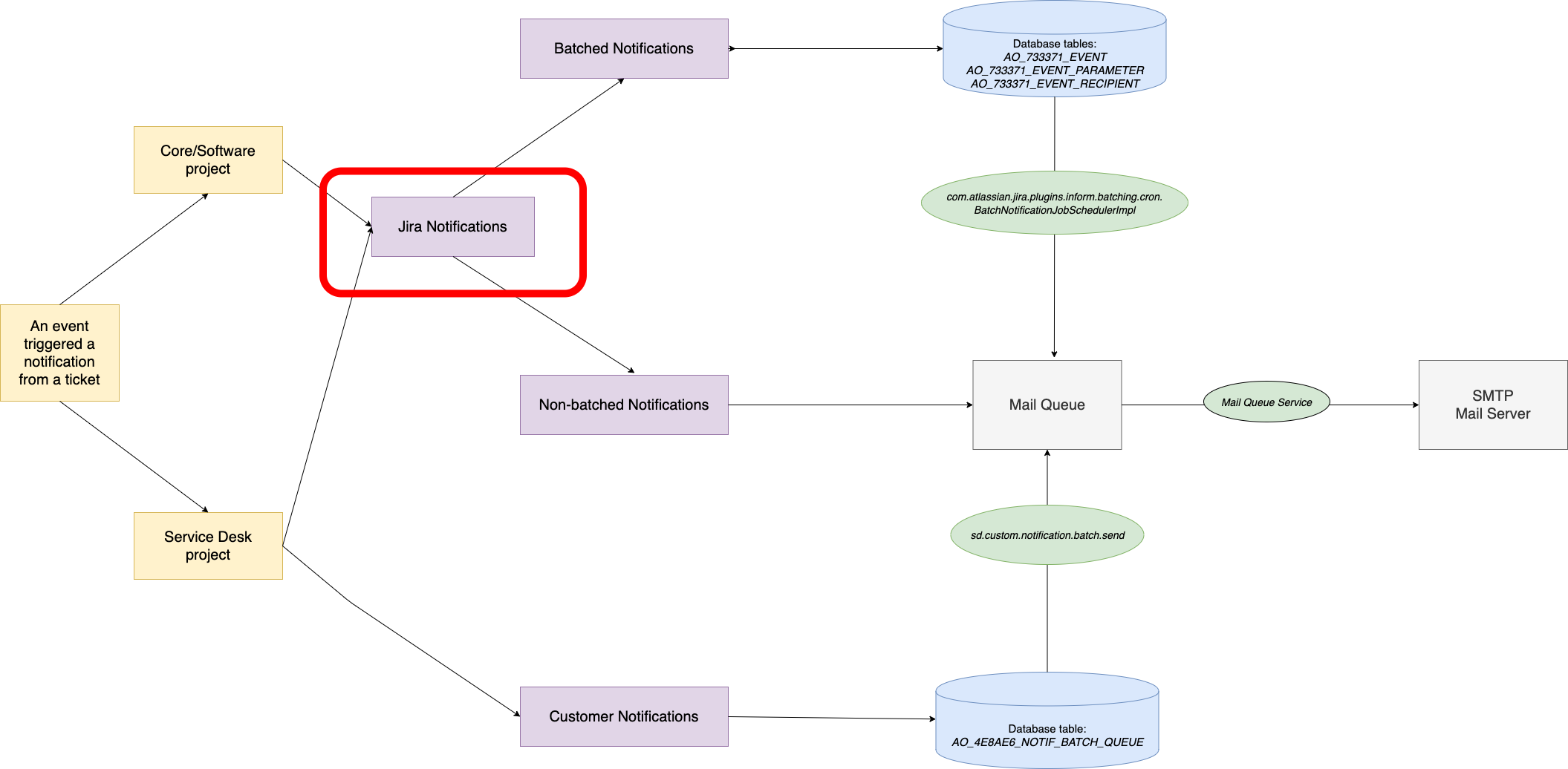 As you can see in the diagram above, various factors including Jira services, database tables, and a mail server are involved in the entire process from the moment an event triggers a notification, and the notification email is actually sent.