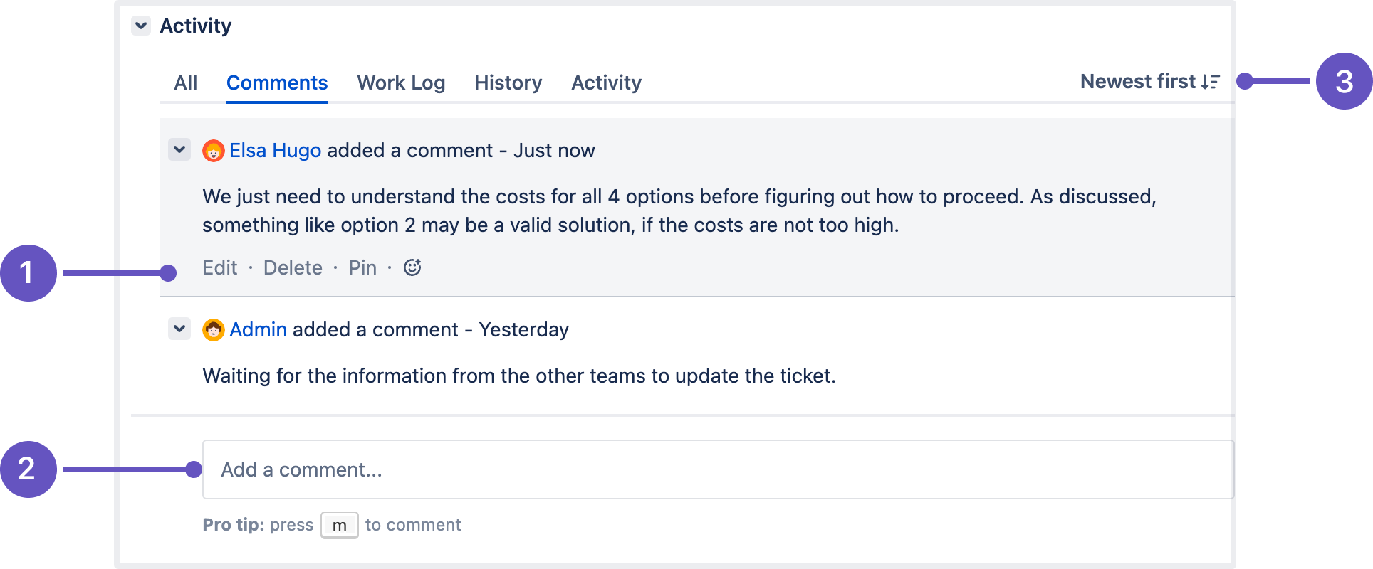 After you pin a comment, it’ll appear in the Pinned comments section at the top of the Comments tab. The All comments section contains all issue comments, including pinned ones.