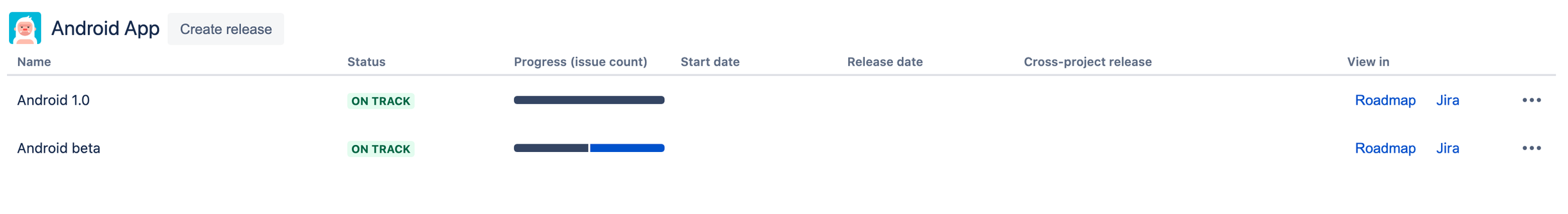 The first way to monitor the health of your releases is to navigate to the Releases tab. Next to each release, you’ll see the status, progress bar (issue count), start and release dates, and any cross-project releases it’s included in, as demonstrated below: