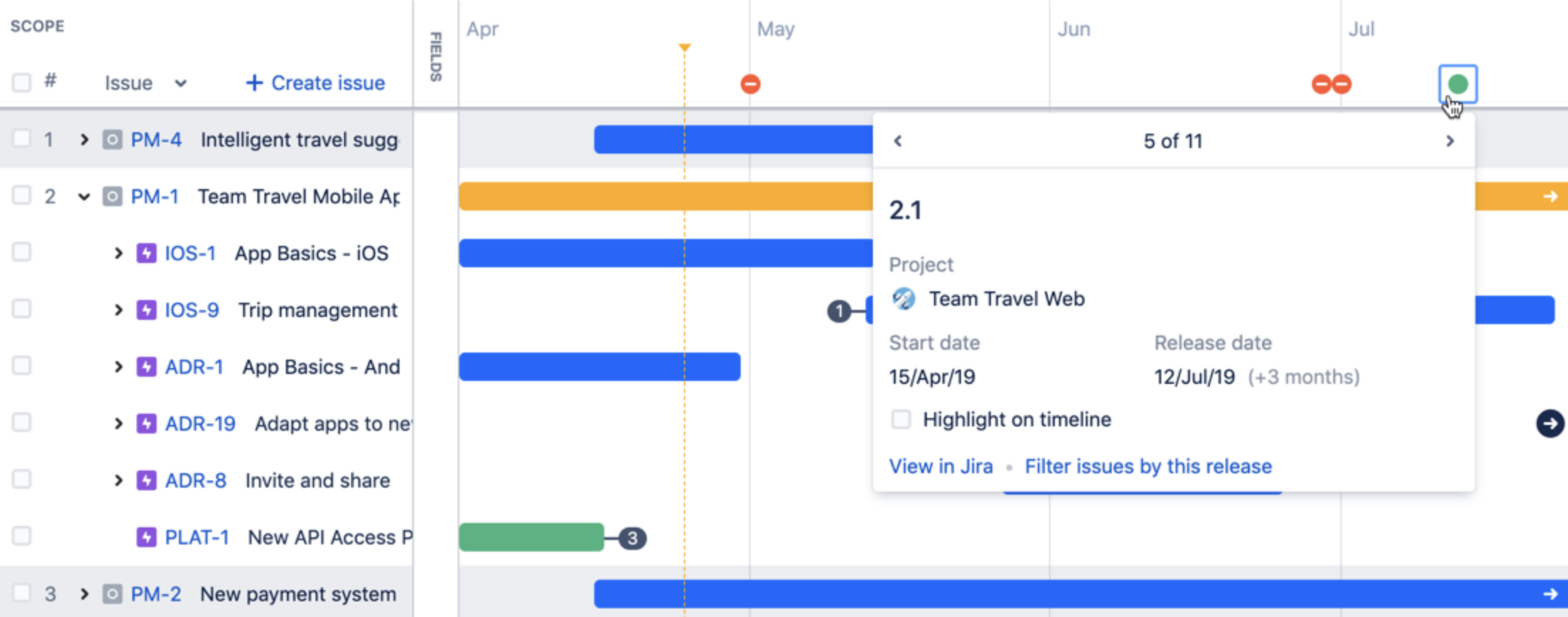 Lastly, you can highlight issues contained in a release on your timeline. Select the Highlight on timeline check box, and the release will be displayed with either a red or green line in the timeline.