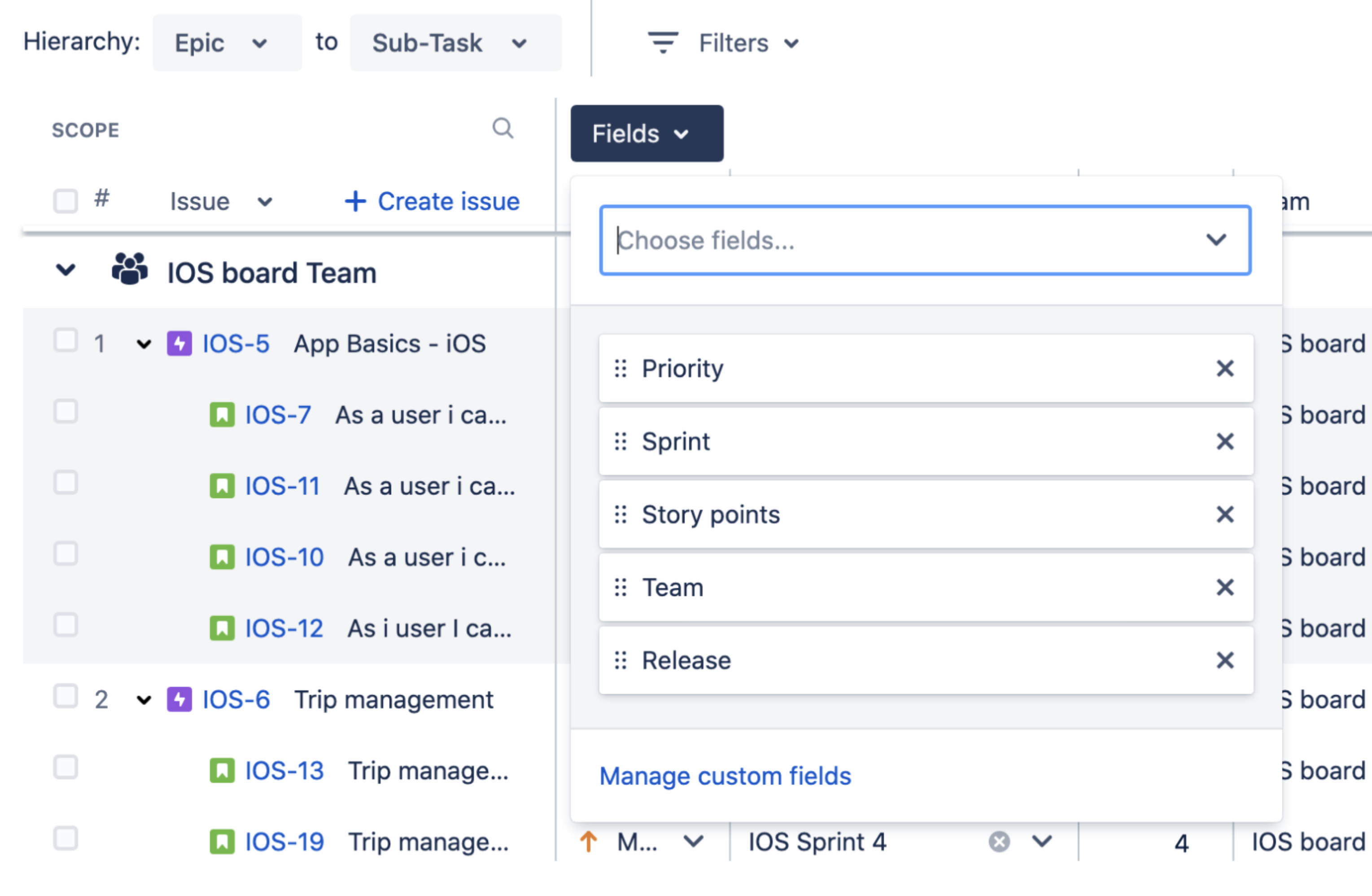 If you’d like to add more issue details to your plan, use the Fields menu to add the relevant fields. These fields will be displayed as columns, containing issue details pulled from Jira Software.