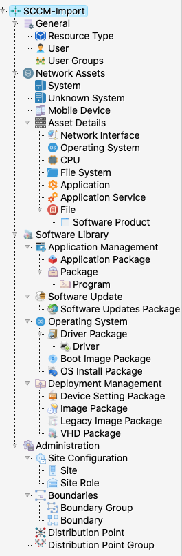 The data collected from SCCM is assembled and imported into Assets. The Object Schema Tree looks like this in Assets: