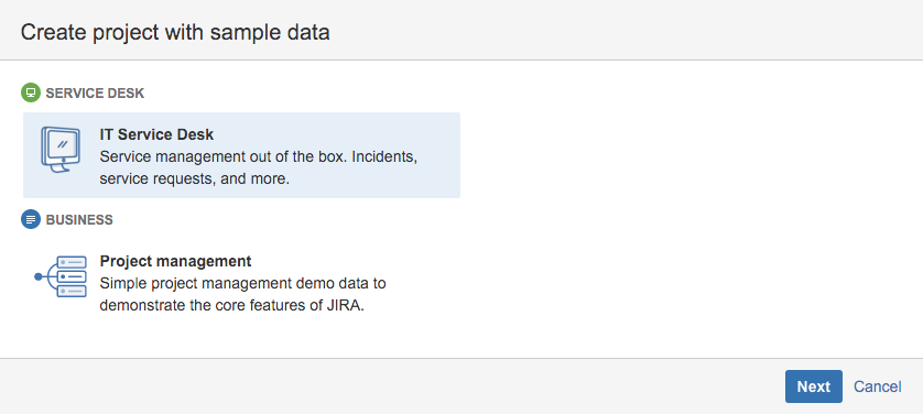 - In the Create project with sample data screen, select IT Service Desk and click Next.