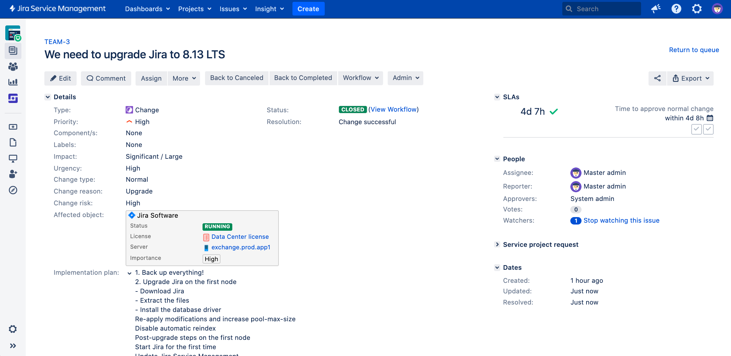 Completing and closing the change Once Jira is upgraded and the work is done, we can complete the change, and see how everything is green again. When closing the change request, you can select the resolution: Change successful or Change failed. | |