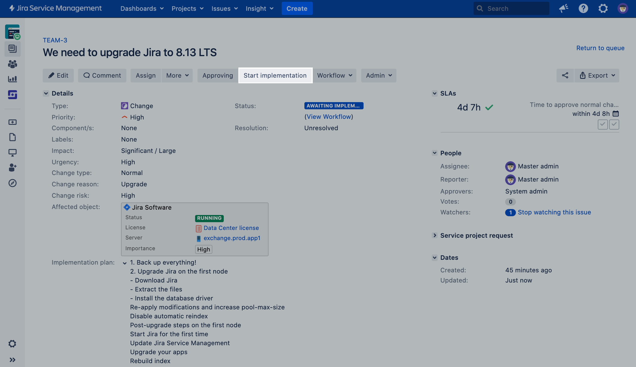 This will help the approvers take necessary steps when approving this change—for example, they could move the date to a weekend and make sure that the teams using this Jira instance can work without it. | |