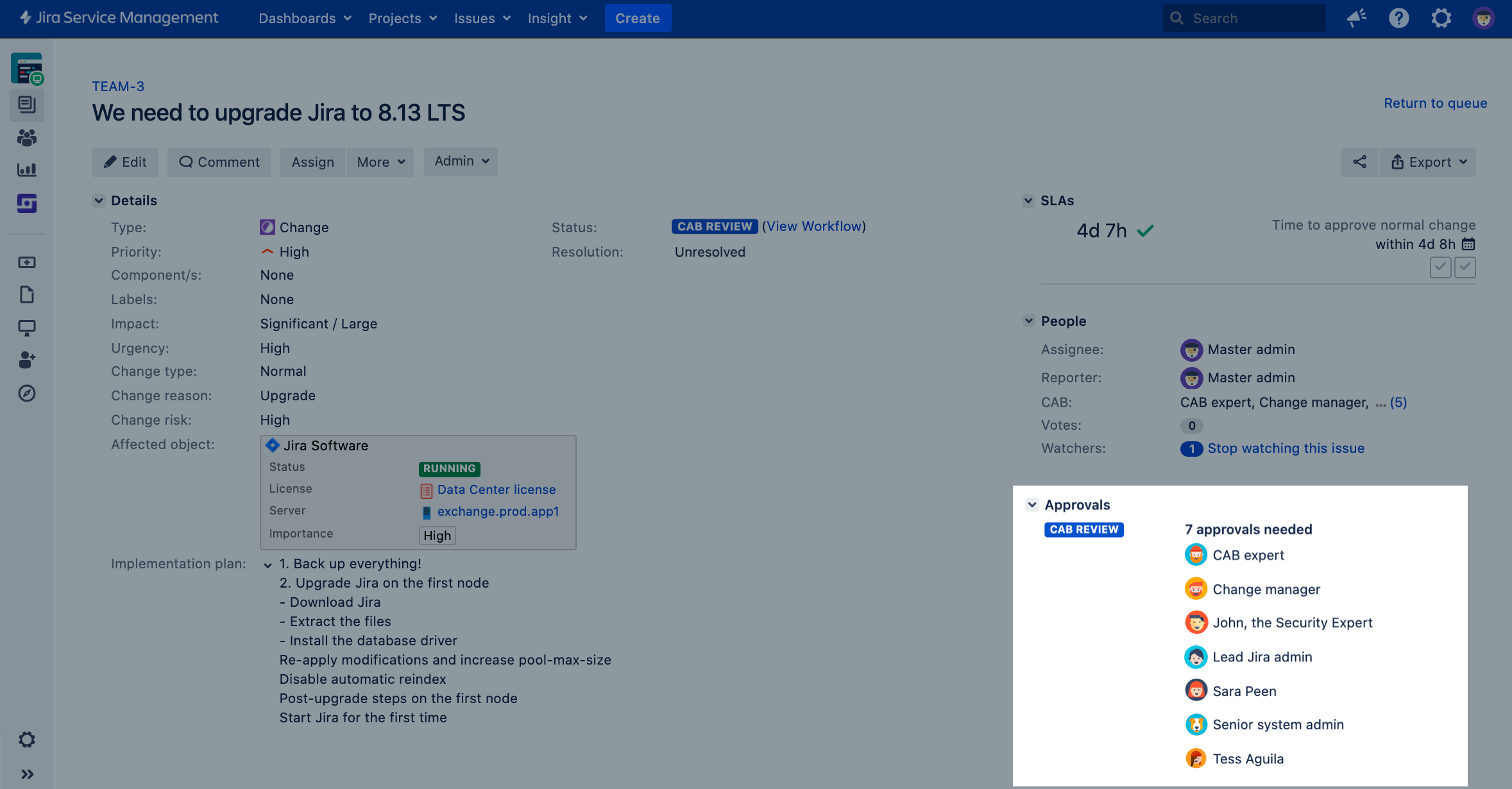 Assessing the risk: CAB review After the initial review, the change is moved to the next approval step. Normal changes don’t have established processes so it’s good to properly assess them. Here the change is being assessed by the Change Advisory Board (CAB) that can include additional experts to reduce the risk and avoid any problems. | |