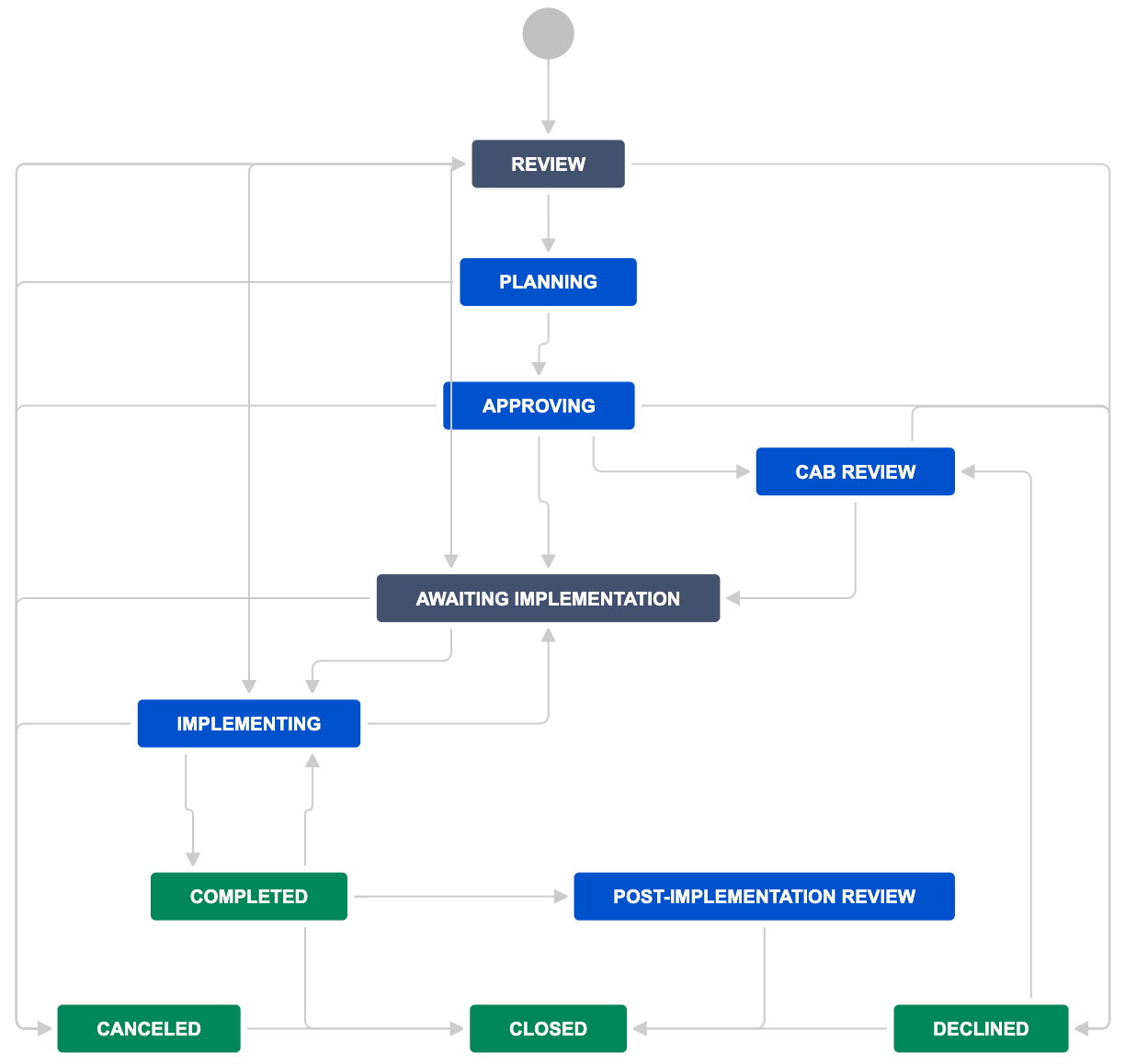 This can be done through Assets post-functions added to the workflow. In this case, they change the object’s attribute when the change request is moved through a certain transition. This is not part of change management. If you’d like to use it, see Adding Assets functions to workflows in Jira. | |