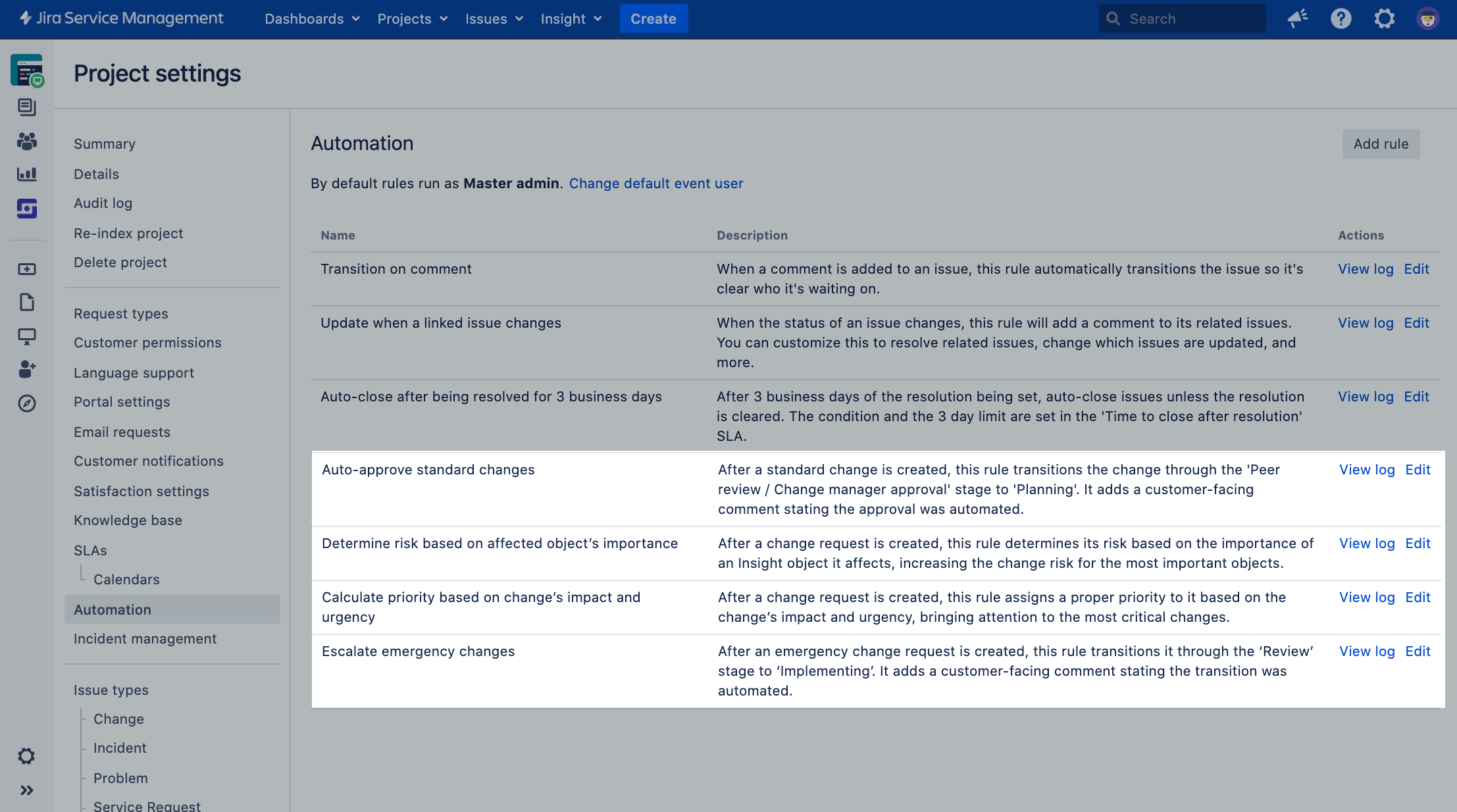 | In this case, automation rules don’t affect the change request that much, because Normal changes should go through all workflow steps and approvals – they usually don’t have established processes, yet are not emergencies, so we have time to review them. | |