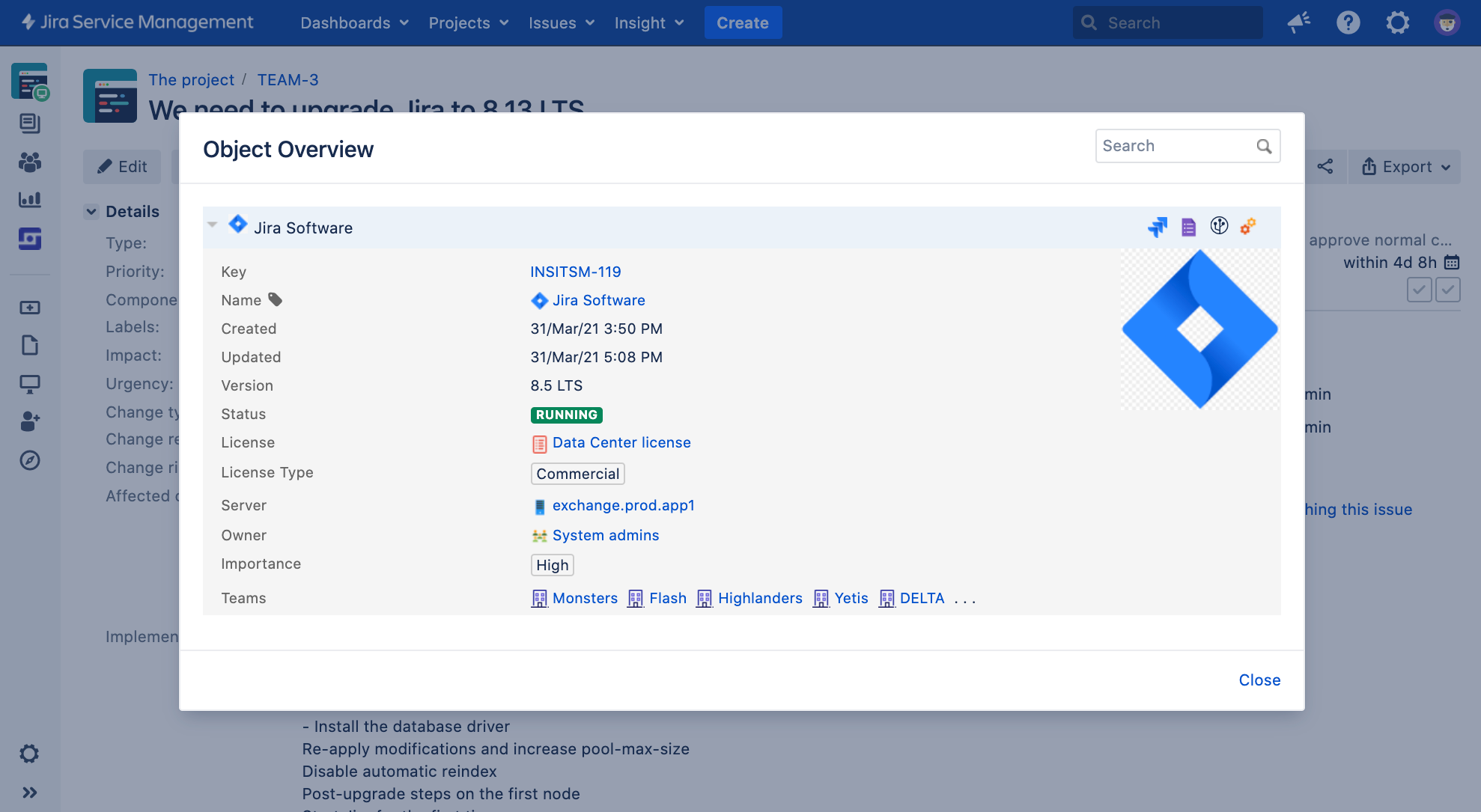 Viewing the asset on the change request After the change request is created, details of our Jira instance are pulled into the request. Both you, and everyone interested, can view it. You can configure what exactly is displayed here… | |