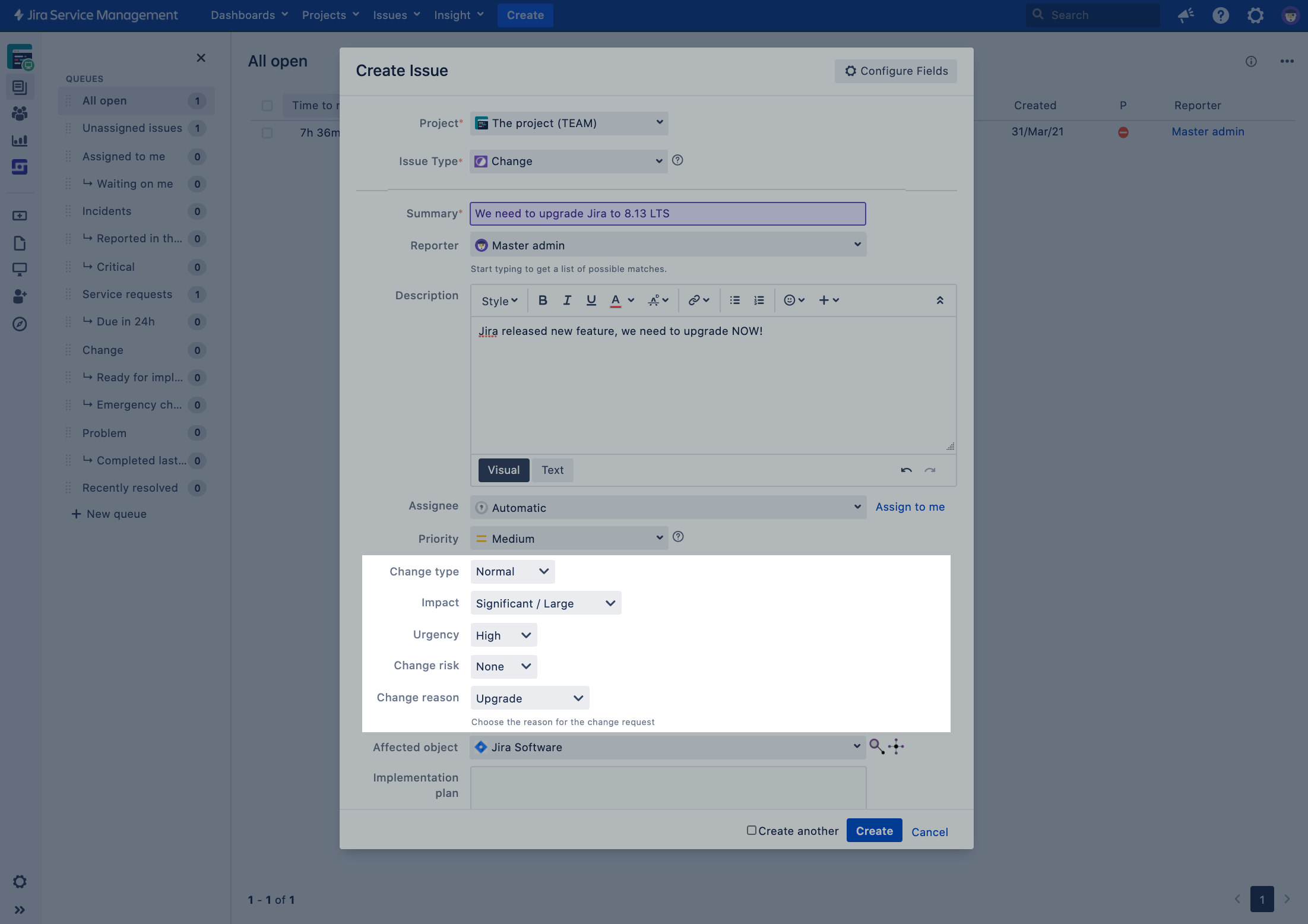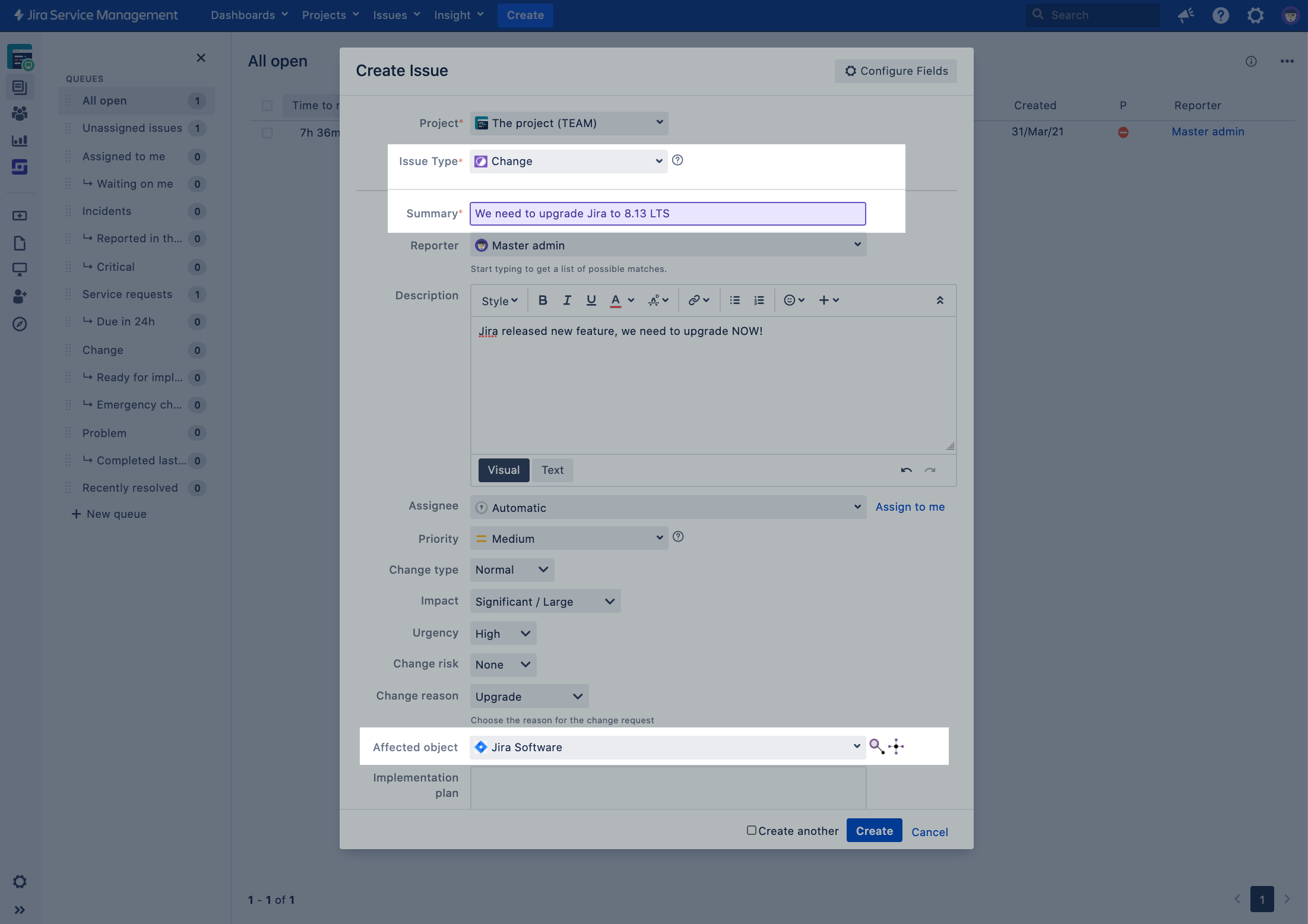 Creating a change request Let’s open a change request, and choose this Jira instance as an affected object. | |
