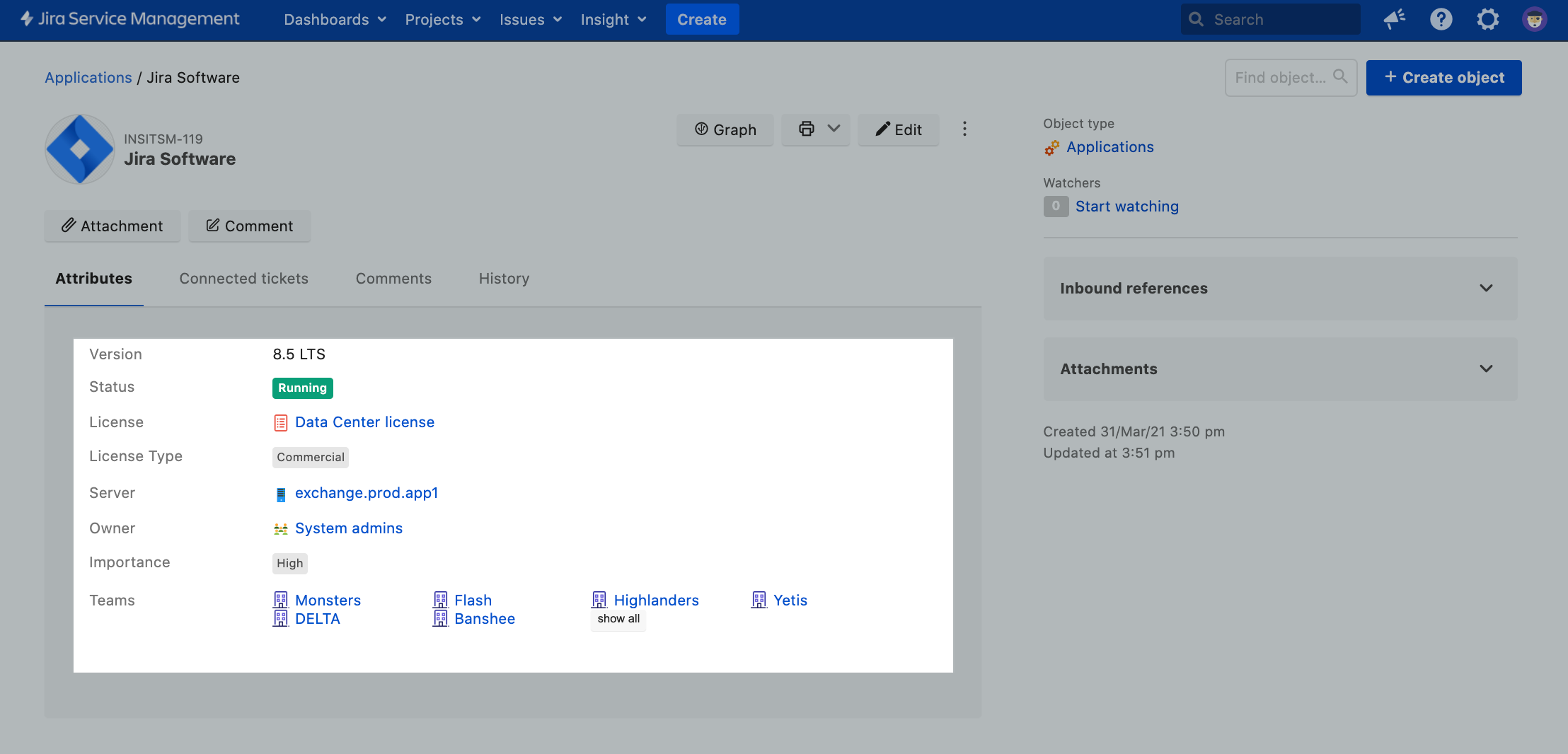 Viewing an asset in Assets Let’s have a look at our Jira instance (asset) in Assets. It’s quite an old version and we want to get it upgraded to get new features, security updates, and all the other bug fixes. We’ll open a change request against it to upgrade it to the latest LTS release: 8.13. | |