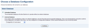 If you selected 'External Database' in the previous 'Choose a Database Configuration' screen, you will need to provide the configuration details for your database. Please see Connecting Bamboo to an external database for further instructions.