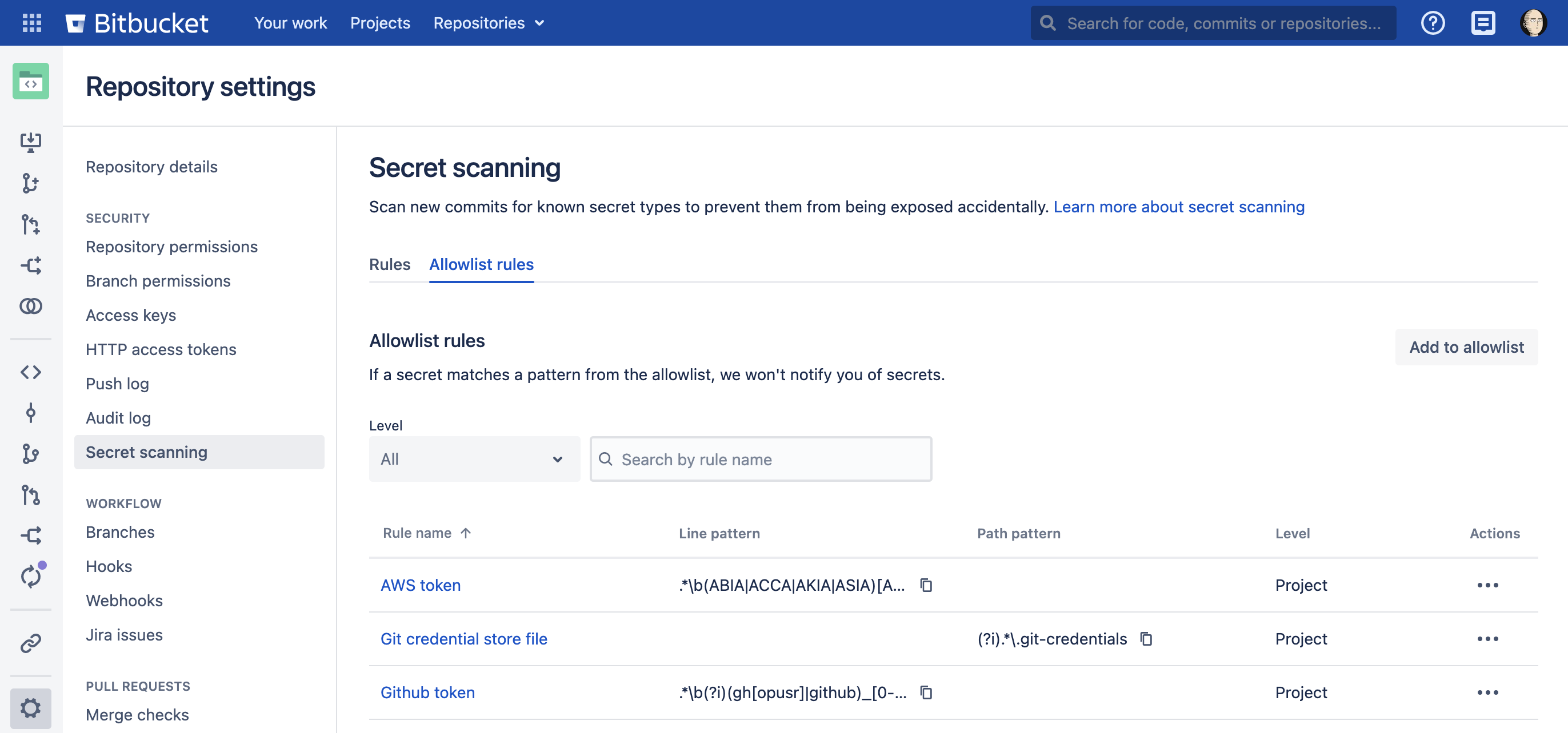 Use the allowlists at the project and repository levels to specify patterns that aren’t secrets.
