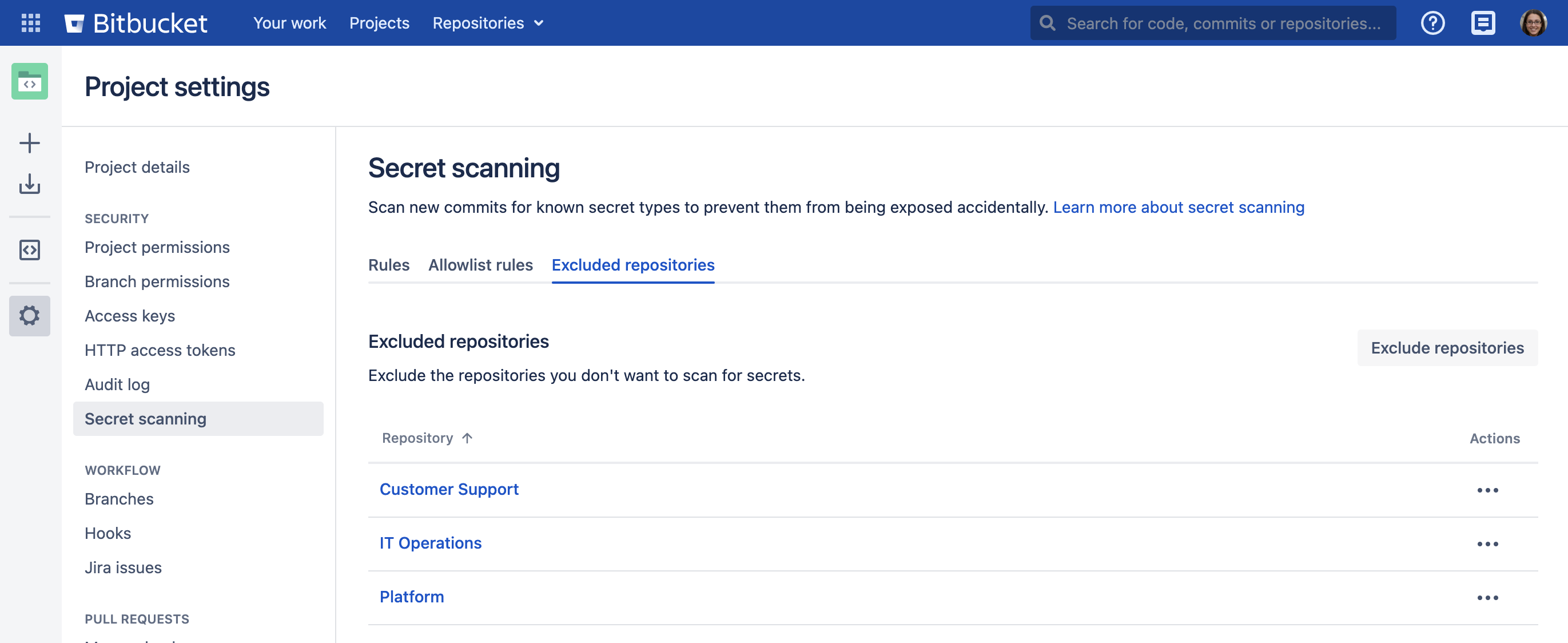 You can exclude specific repositories from scanning at the global or project level. Admins can also exclude all personal repositories at the global level. When excluded, Bitbucket won’t scan any new commits added to the repository.