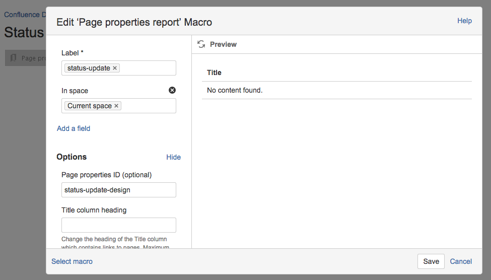 We've also added a status macro. - Edit the Page Properties macro and enter a Page Properties ID for this macro (in this example we'll use 'status-update-design'. This will allow us to report on the status of just the Design team later on)