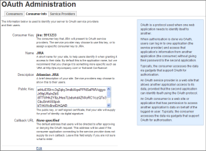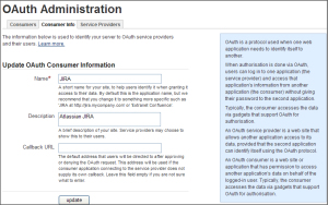 An OAuth 'consumer' is an application that accesses ('consumes') data from another application. If you would like to add JIRA as a consumer to another external application (service provider), you will need to provide JIRA's consumer information to that application. For example, if your users want to add JIRA gadgets to their iGoogle dashboards, they will need to provide the consumer information for JIRA to iGoogle. You can also configure some optional information that can help identify your JIRA instance to users.