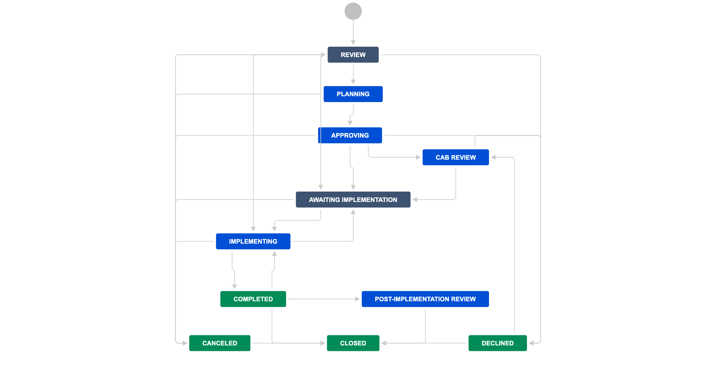 Jira Service Management has a default change management workflow, but we’ve updated it with additional statuses and transitions. You can download the ready workflow from Atlassian Marketplace, and have all the missing statuses created automatically.